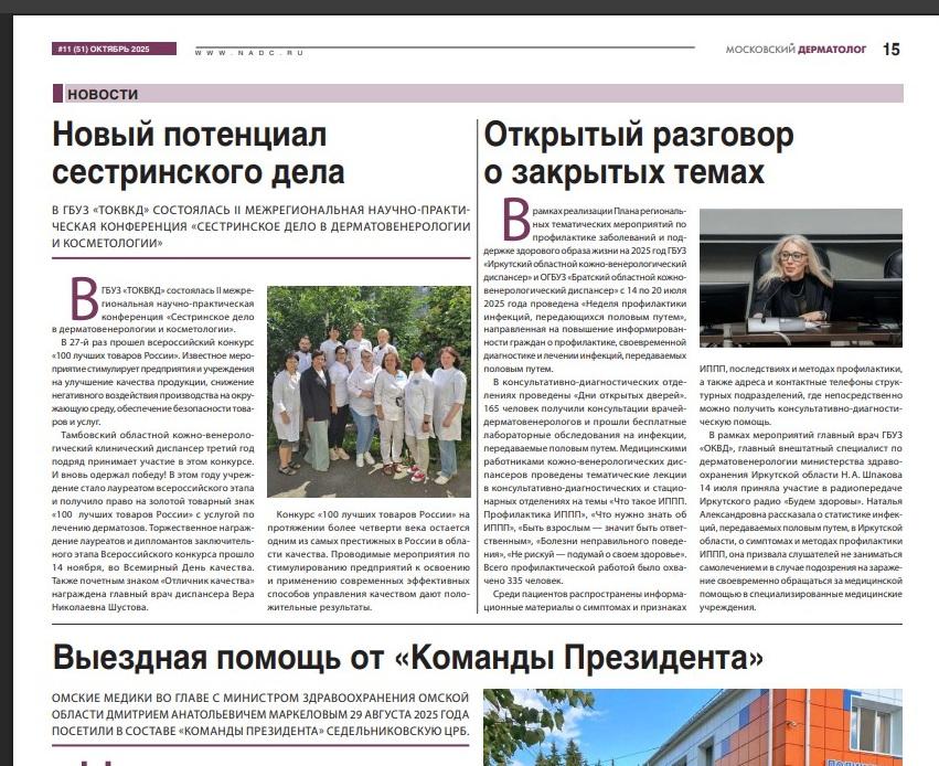 В 11(51) номере за октябрь 2025 года опубликована статья о достижениях ГБУЗ ТОКВКД. Второй год подряд наше учреждение единственное в стране проводит научно-практические конференции по профилю «дерматовенерология и косметология» для среднего медицинского персонала.