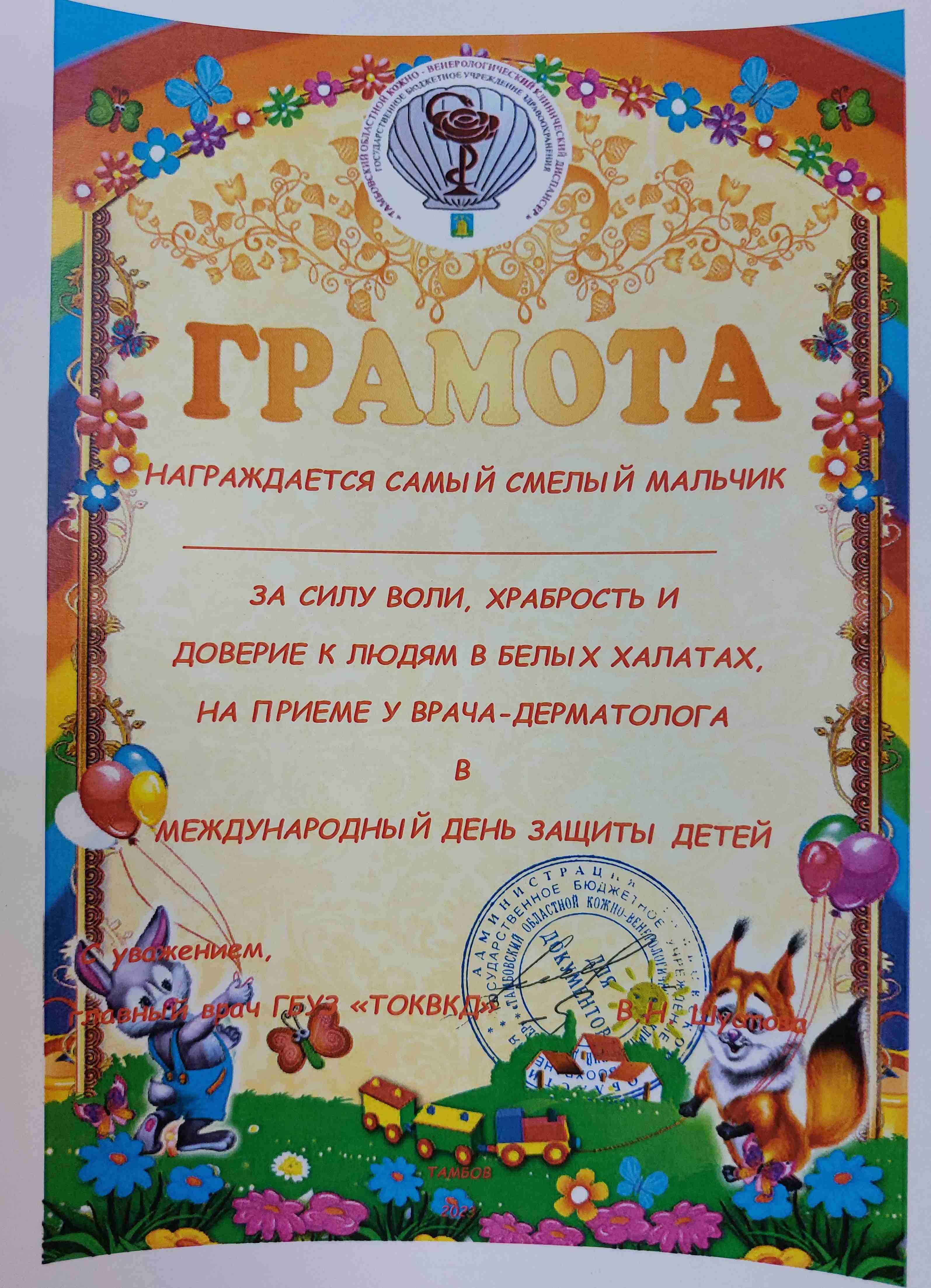 В детской поликлинике ГБУЗ «Тамбовский областной кожно-венерологический клинический диспансер» 1 июня уже традиционно маленькие пациенты получали грамоты за визит к врачу-дерматологу, за силу воли, храбрость и доверие к людям в белых халатах.