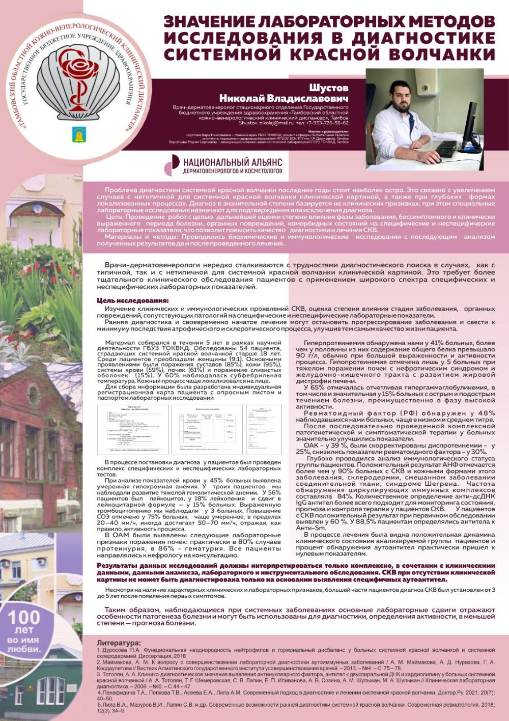 Город Тамбов прозвучал на площадке такого высокого уровня третий раз. Тема исследовательской работы нашего молодого коллеги – «Значение лабораторных методов исследования в диагностике системной красной волчанки». Цель данной работы – изучение клинических и иммунологических проявлений СКВ, оценка степени влияния стадии заболевания, органных повреждений, сопутствующих патологий на специфические и неспецифические лабораторные показатели.