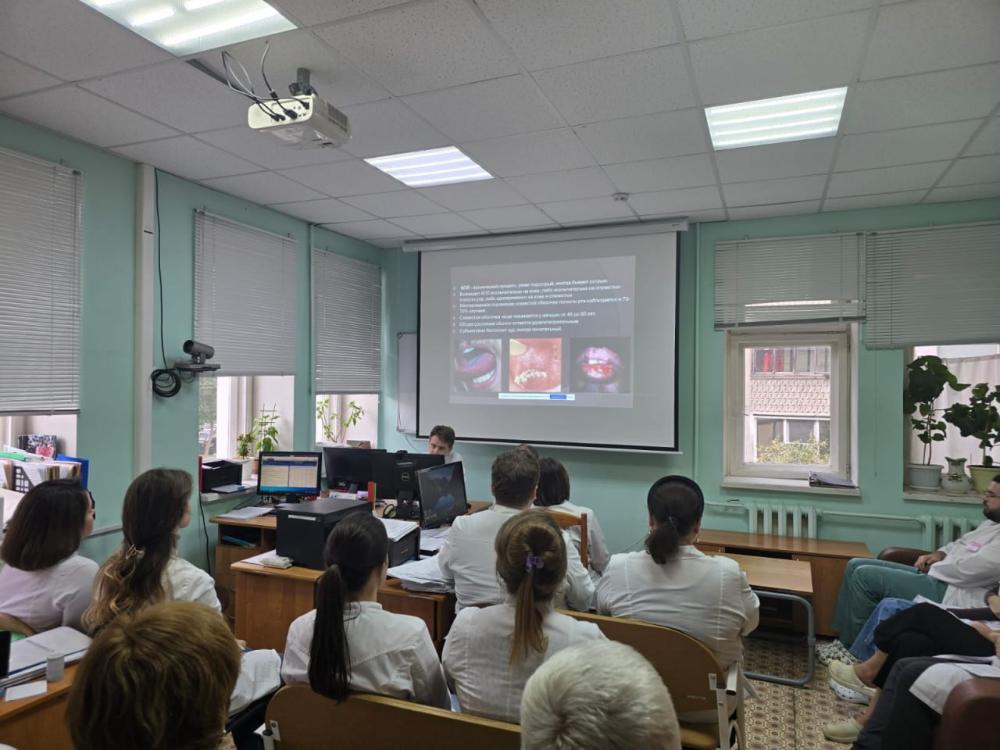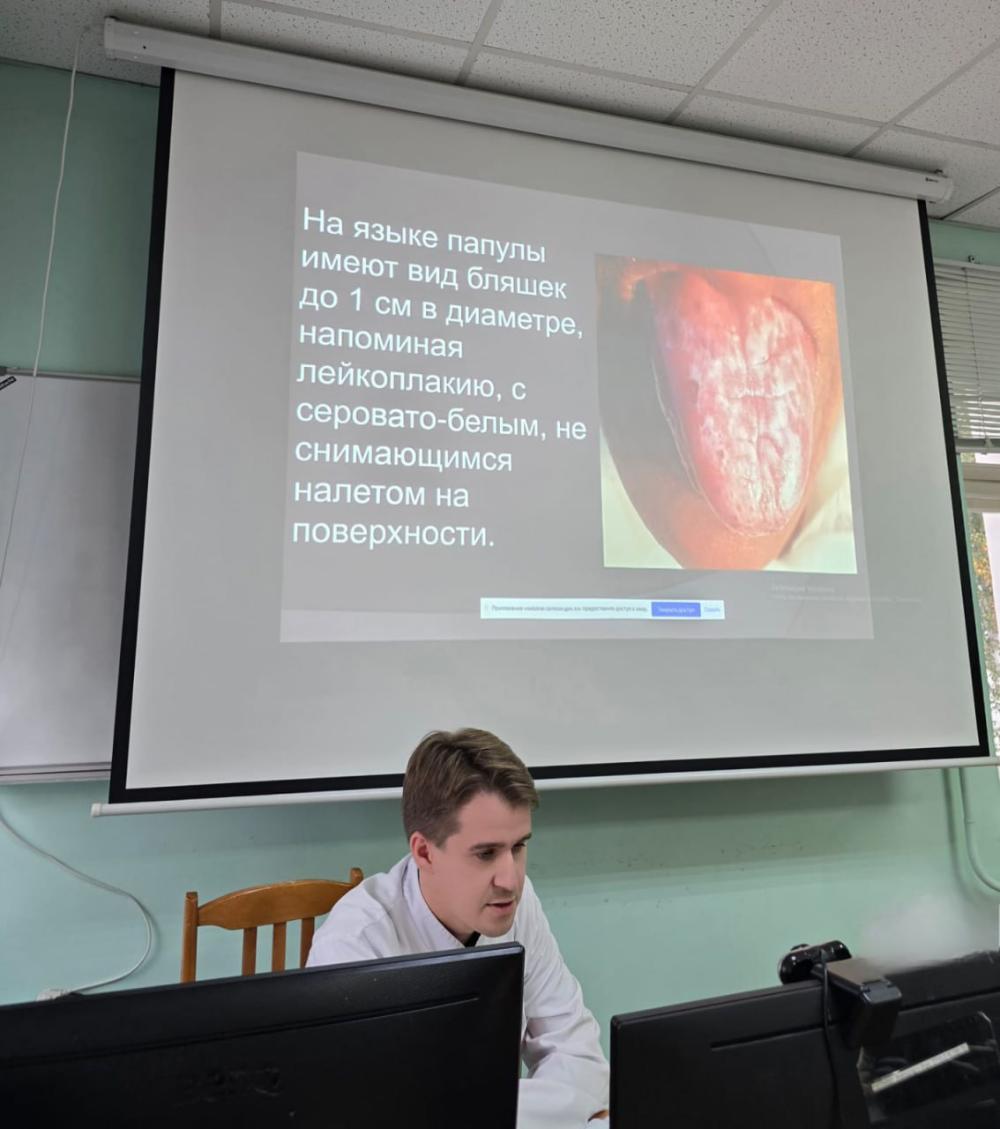 Далее врач-дерматовенеролог стационарного отделения Осипов Данил Алексеевич поделился своим клиническим наблюдением за пациентом с красным плоским лишаем слизистой оболочки полости рта. Доктор подробно в своем докладе остановился на трудностях диагностики при данной локализации и ошибках, которые возникают у врачей смежных специальностей.