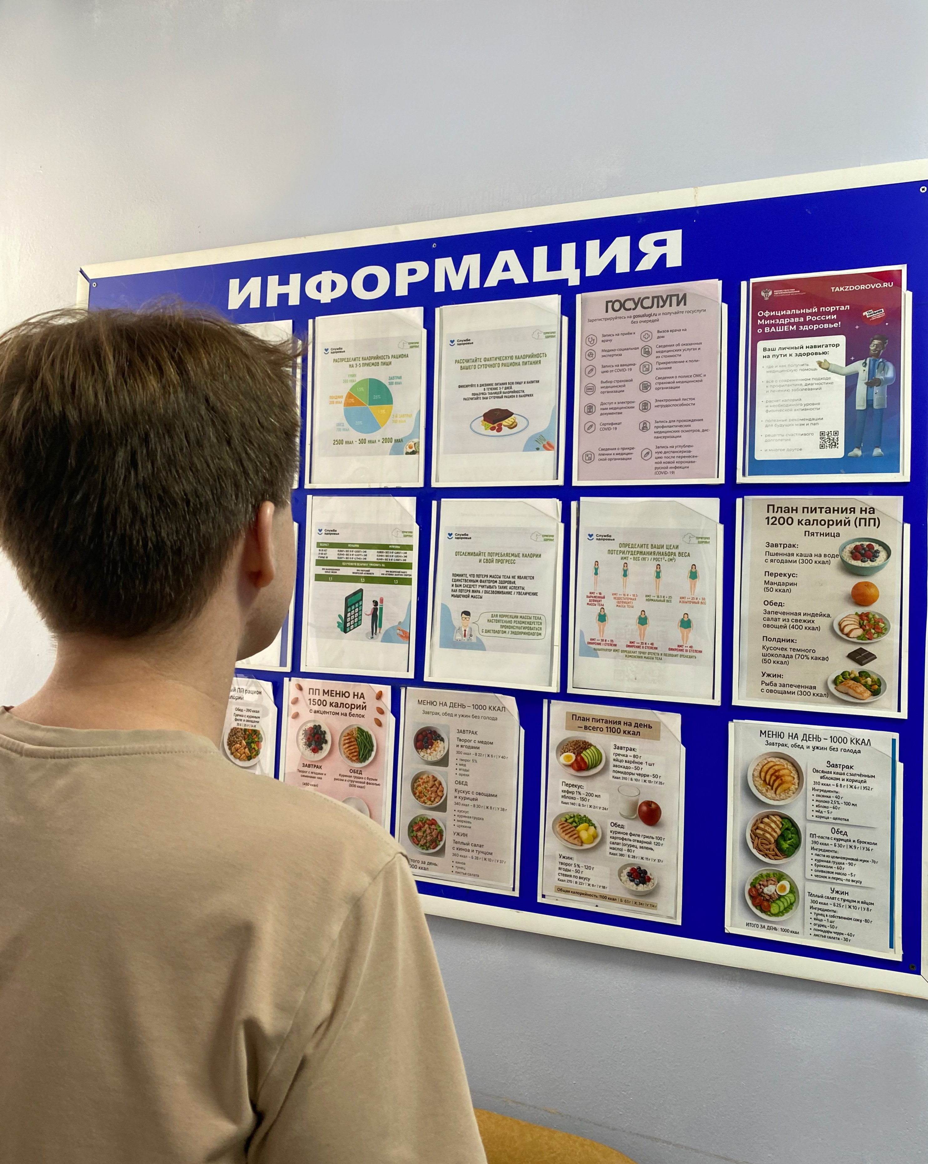 - в холлах учреждения размещена наглядная инфографика, которая, объясняет принципы энергетического баланса, приводит примеры суточной потребности в энергии для разных возрастных и профессиональных групп, демонстрирует типовые порции и их калорийность и даёт алгоритмы расчёта индивидуальной нормы калорий.