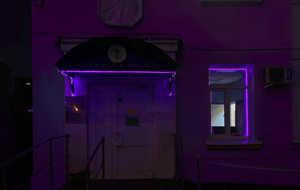 - Световое оформление - входная группа детской поликлиники была декорирована фиолетовой подсветкой. Мягкий сиреневый свет создавал атмосферу заботы и напоминал посетителям о значимости дня.