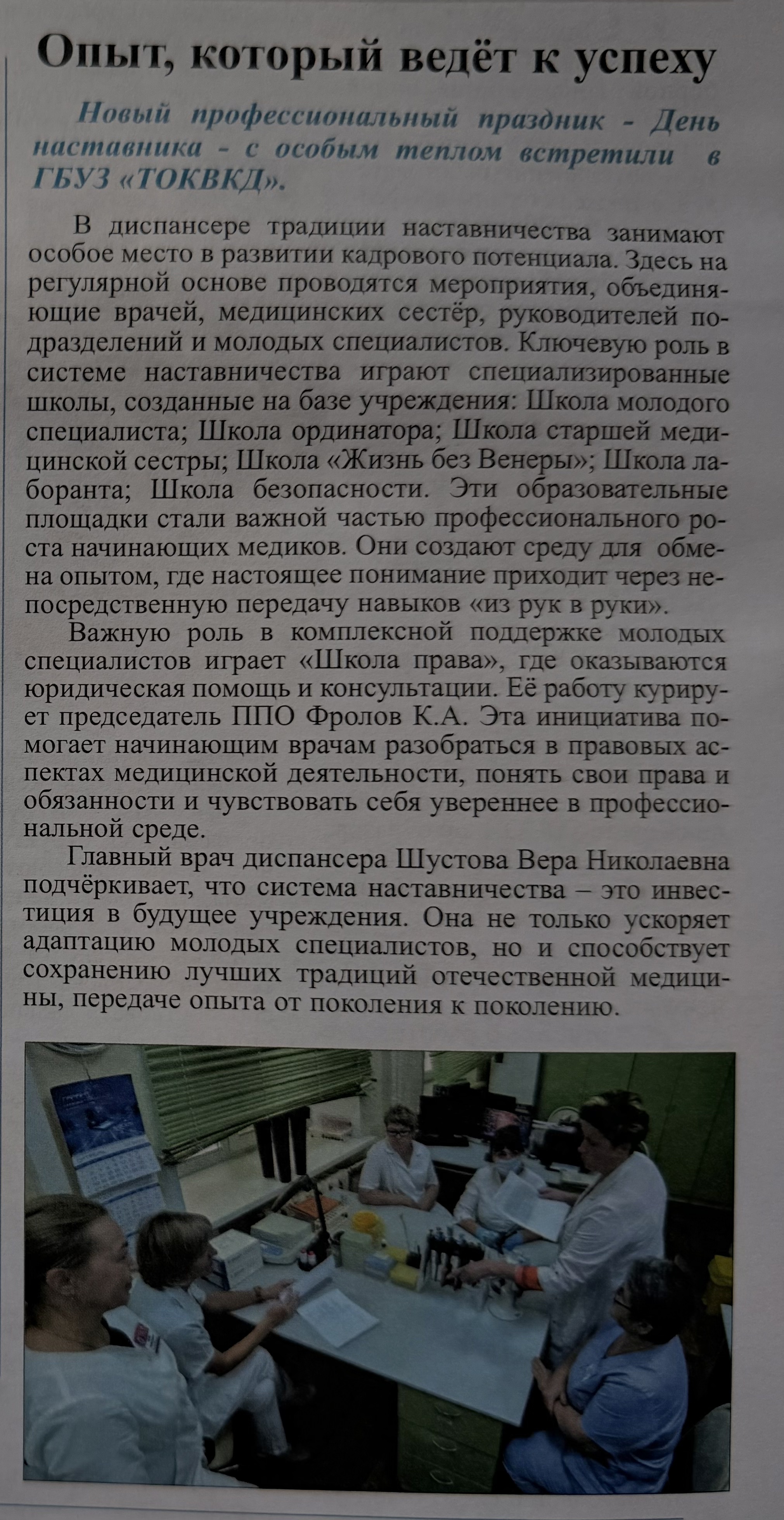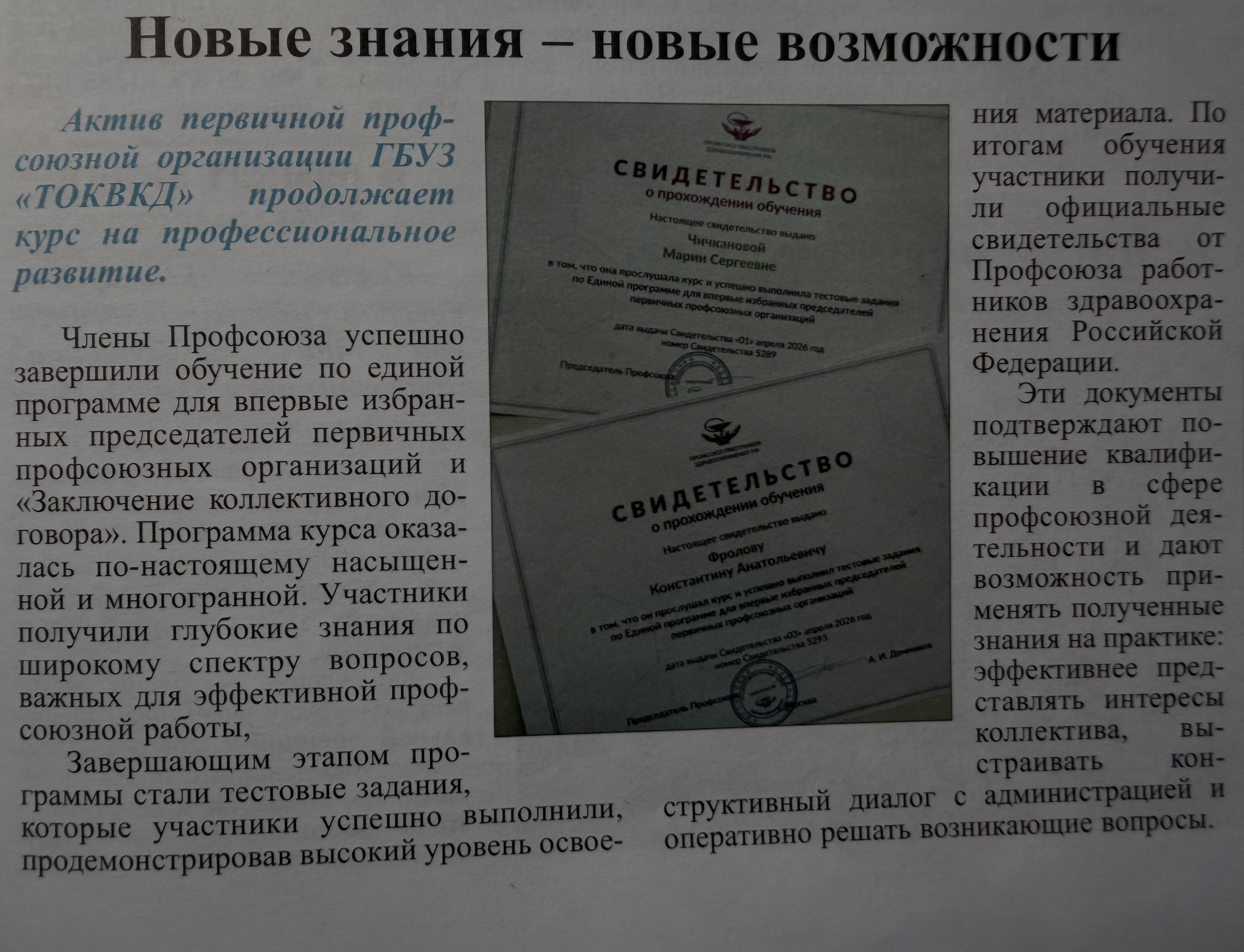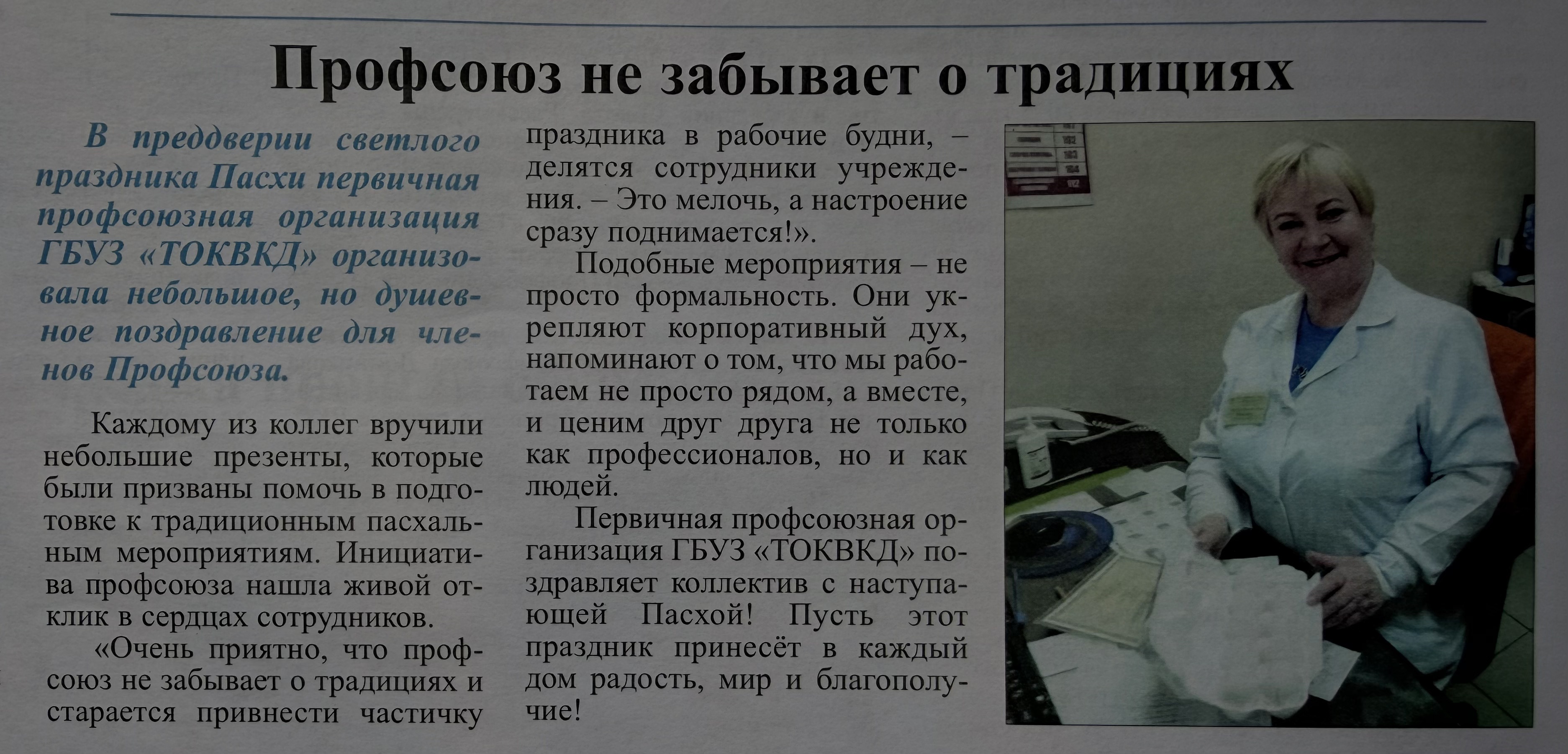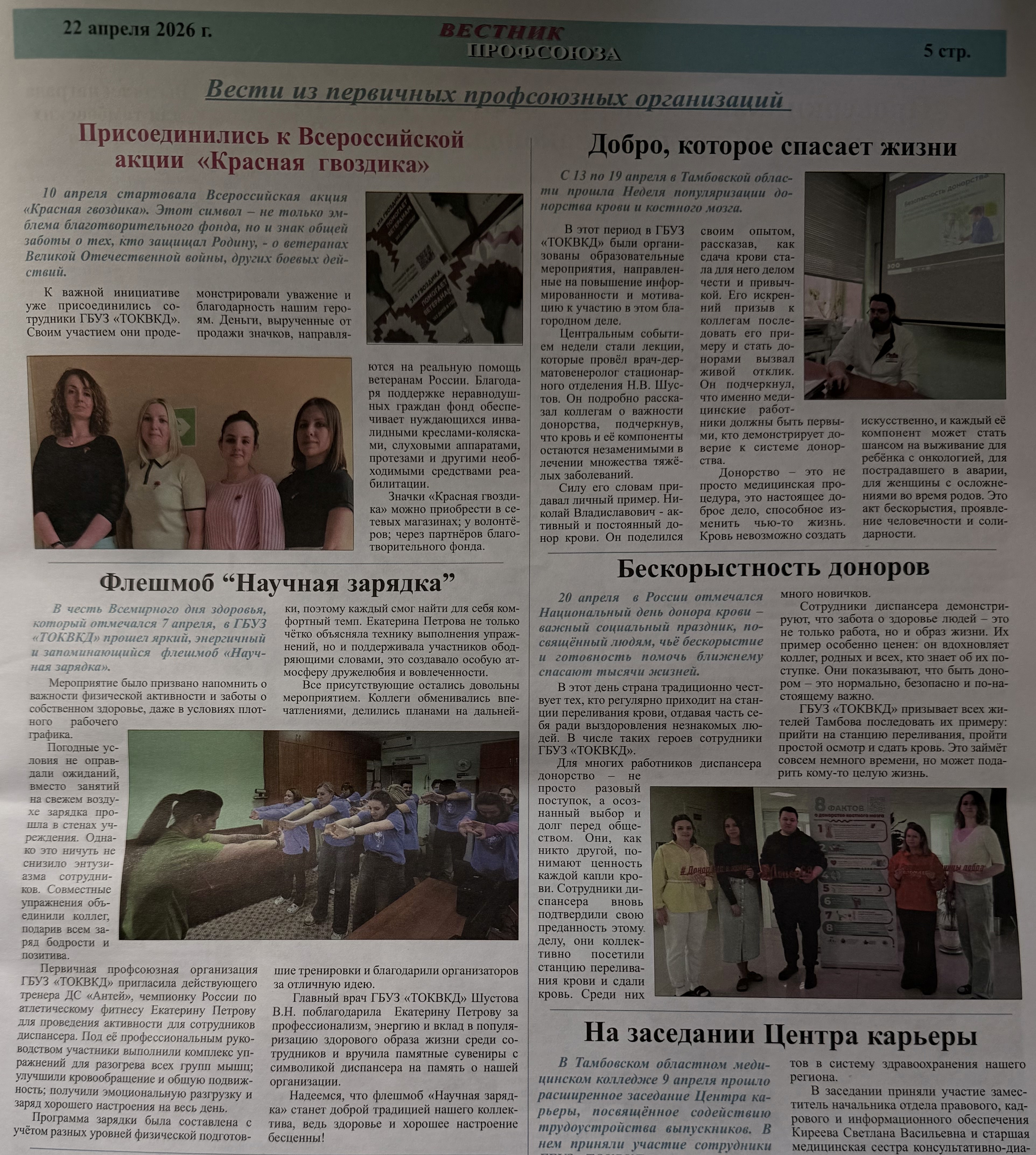 Деятельность нашего диспансера – ГБУЗ «ТОКВКД» – получила освещение в профсоюзном издании. В выпуске газеты «Вестник профсоюза» (№ 433–436 от 22.04.2026) опубликовано сразу несколько колонок и рубрик, посвящённых активной жизни коллектива учреждения.