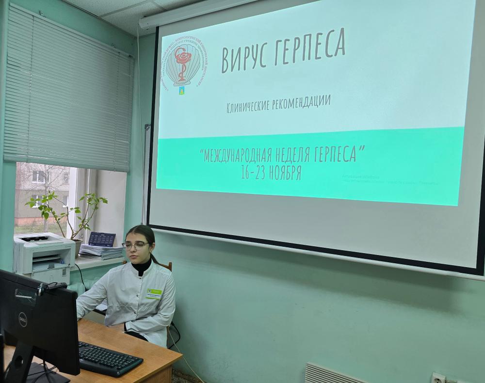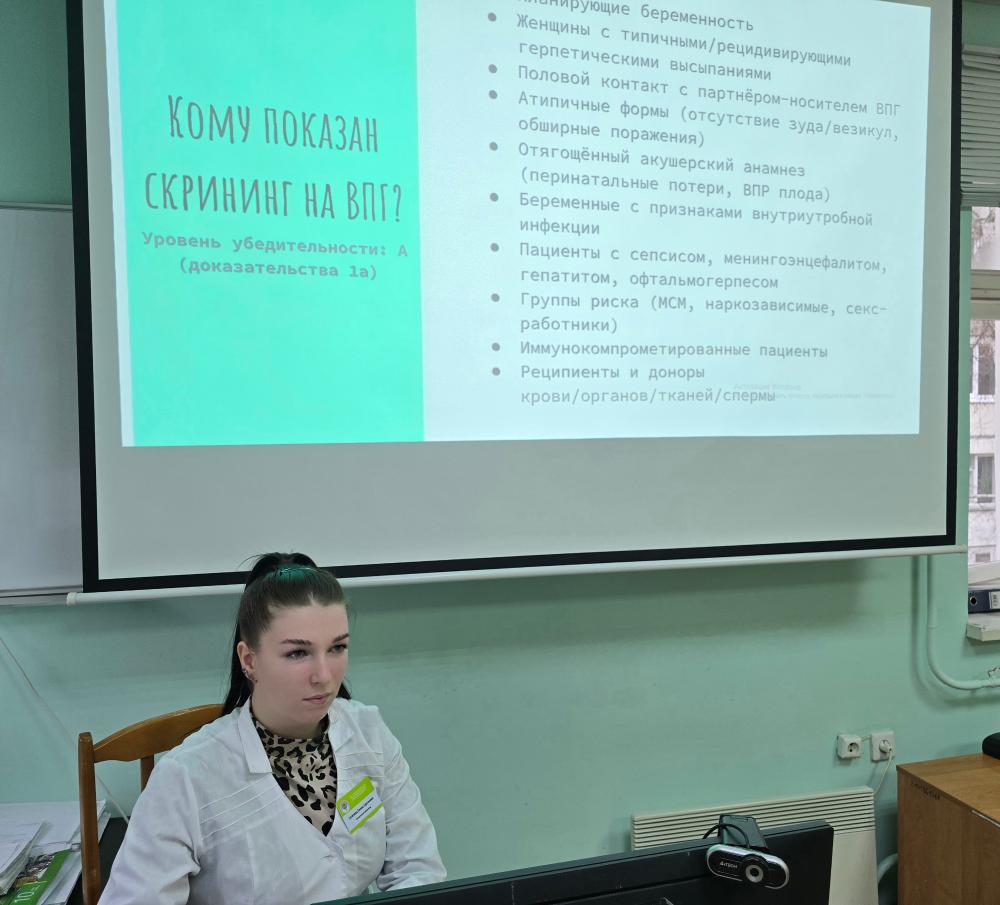 Далее ординаторы первого года обучения Черкасова Елена Владимировна и Гугичева Елена Сергеевна ознакомили присутствующих с новыми клиническими рекомендациями «Простой герпес у взрослых», утвержденными в 2025 году и действующими с 27 октября текущего года. Эти рекомендации, разработанные Национальной ассоциацией специалистов по инфекционным болезням имени академика В. И. Покровского (НАСИНБ) совместно с Общероссийской общественной организацией «Национальный альянс дерматовенерологов и косметологов», представляют собой важнейшее руководство для современной клинической практики.