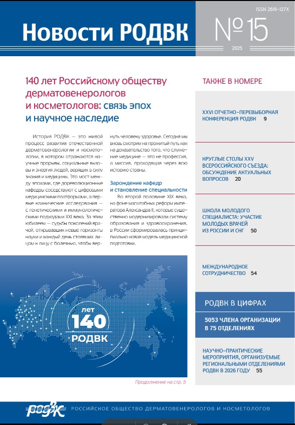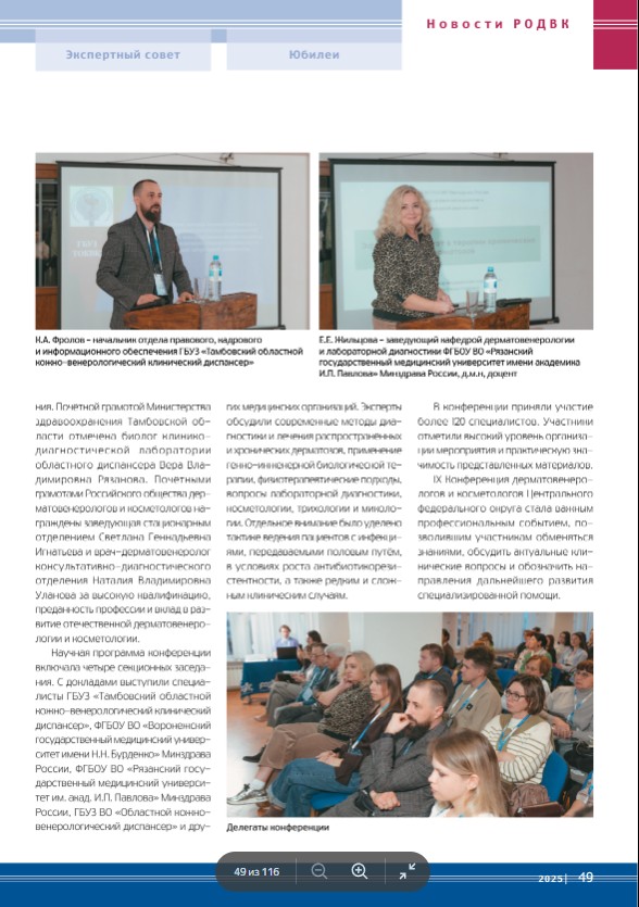 В 15 номере за 2025 год опубликована статья о проведении в нашем регионе IX Конференции дерматовенерологов и косметологов Центрального федерального округа, объединившая специалистов региональных дерматовенерологических служб, представителей органов здравоохранения регионов и научного сообщества.