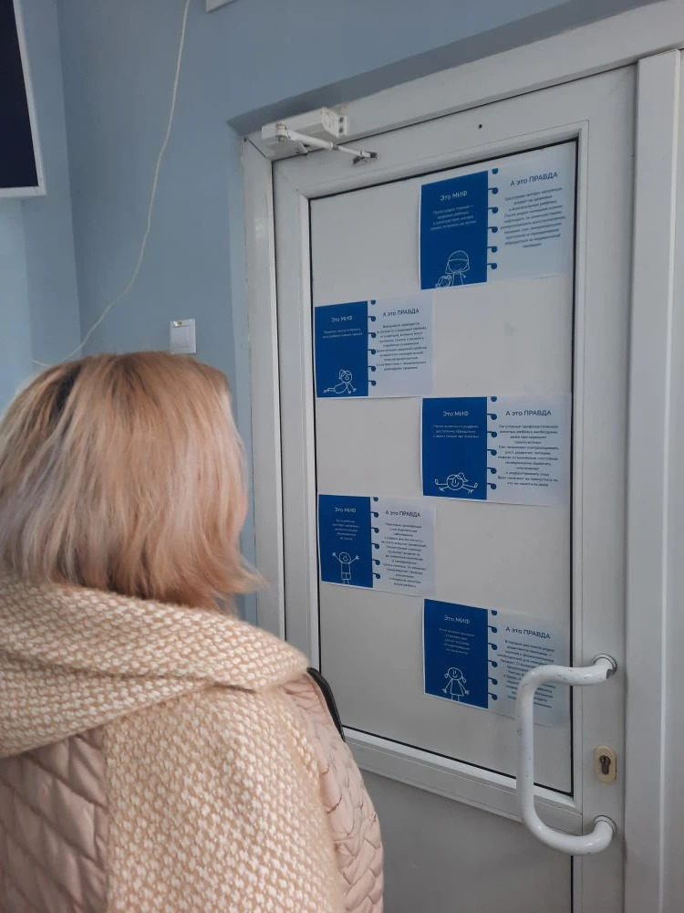 В холле отделения детской поликлиники размещена информационная экспозиция с наглядными материалами по ключевой теме «Миф или правда?» – серия плакатов, где популярные заблуждения (например, «Вакцины вызывают аутизм», «Смеси лучше грудного молока», «Во время беременности нельзя заниматься спортом») сопоставляются с научно подтверждёнными фактами.