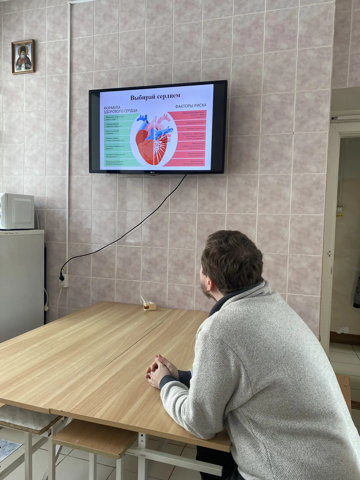 Также, ведется демонстрация видеоматериалов в зонах ожидания о схеме работы здорового сердца, типичных патологиях и алгоритмах первой помощи при инфаркте и инсульте.