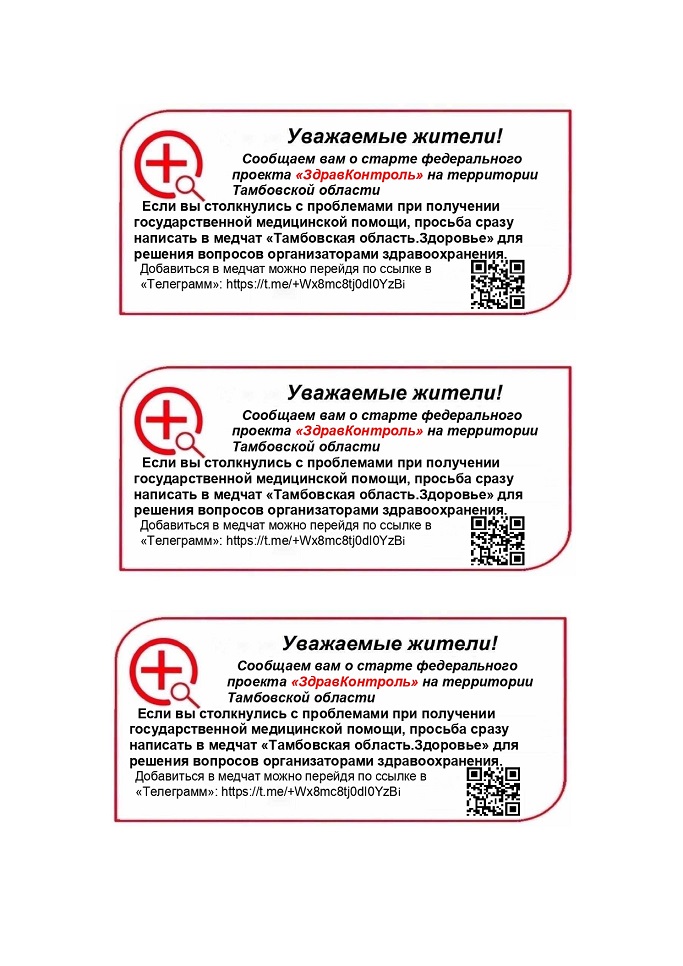 В рамках проекта «ЗдравКонтроль» в Тамбовской области будут работать три чата с 08:00 до 20:00 с понедельника по субботу. Для того чтобы присоединиться, необходимо перейти по ссылке⬇️